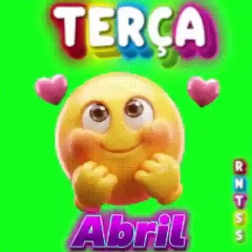 Um emoji amarelo com sorriso e bochechas rosadas, mãos no rosto, cercado de corações rosa e com o texto 'TERÇA' em cima e 'Abril' embaixo.