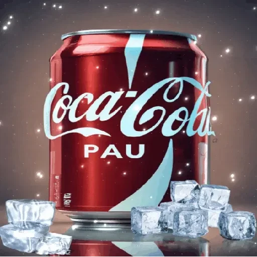 Lata de Coca-Cola com gelo e cubos de gelo ao redor, fundo escuro com faíscas. A lata é vermelha com o logotipo da Coca-Cola em branco e azul. A palavra 'PAU' está escrita em branco na parte inferior da lata.