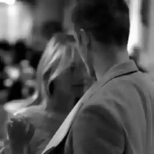 Um casal se beijando, ambos de perfil, em preto e branco.