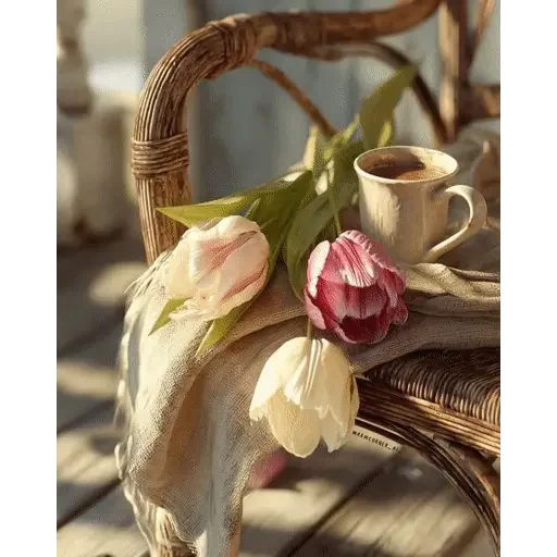 Uma xícara de café ao lado de tulipas brancas e uma rosa em um cadeira de vime.
