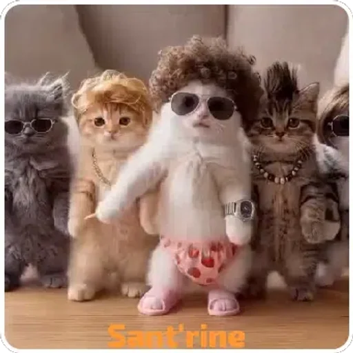 Cinco gatinhos fofos vestidos com diferentes estilos, com o gato do centro usando óculos escuros e calcinha rosa. A imagem tem o texto 'Sant'rina' na parte inferior.