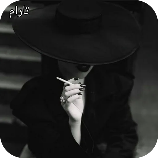 Mulher com chapéu escuro fumando um cigarro, com texto em árabe no canto superior esquerdo.