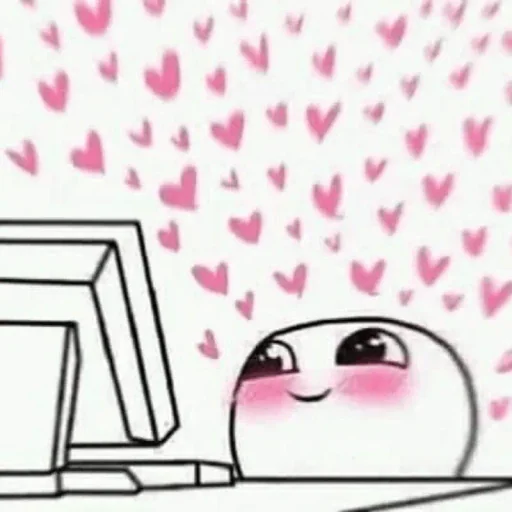 Um desenho de um personagem de anime com bochechas rosadas e sorriso, sentado em frente a um computador com muitos corações rosa ao fundo.