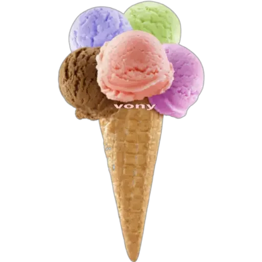 Um sorvete de casquinha com cinco bolas de cores diferentes: rosa, roxa, verde, lilás e chocolate. A palavra 'very' está escrita em baixo.