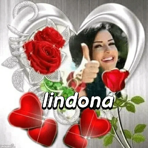 Uma mulher de cabelo preto dá um polegar para cima dentro de um coração prateado, rodeada de rosas vermelhas e corações. O texto 'lindona' está escrito embaixo.