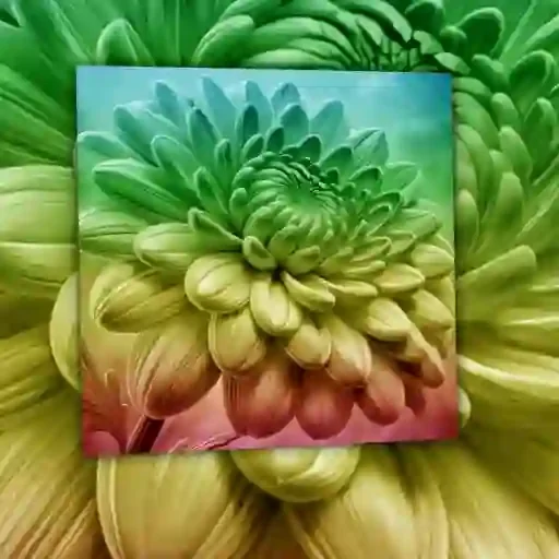 Uma flor grande e colorida com tons de verde, amarelo e rosa, com uma imagem central em close-up.