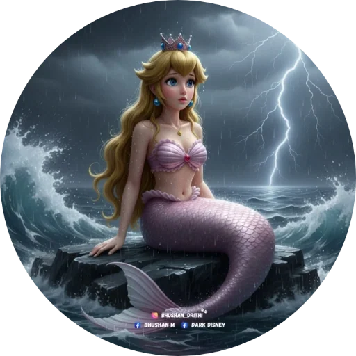 Uma sereia ruiva com coroa, biquíni rosa e calda de peixe sentada em uma rocha em meio ao mar agitado com raios no céu.