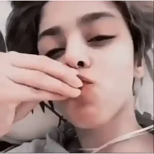 Uma jovem com os olhos fechados e a mão tapando a boca, parecendo tímida ou envergonhada.