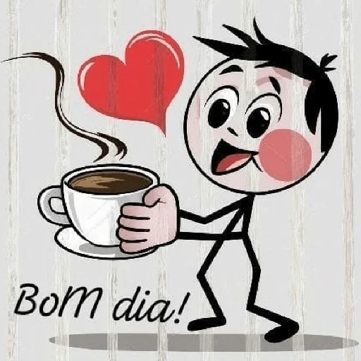 Um personagem de desenho animado com um sorriso largo e bochechas rosadas segura uma xícara de café com vapor saindo e um coração vermelho acima. Ele diz 'Bom dia!'.