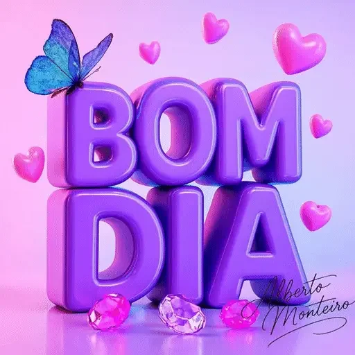 Um sticker de 'Bom Dia' em letras grandes roxas com corações rosa e um borboleta azul. A imagem tem um fundo degradê rosa e roxo.