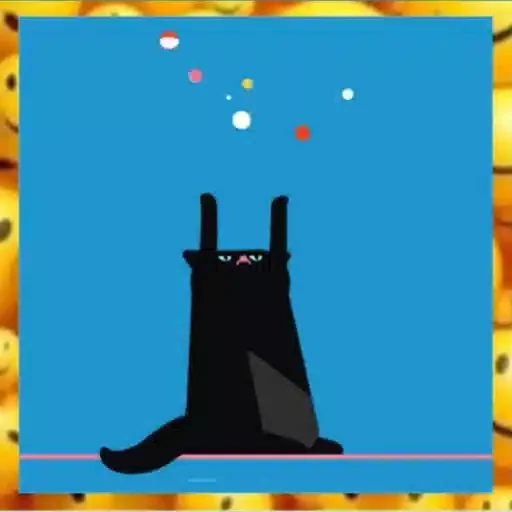 Um gato preto com olhos verdes e boca rosa, sentado em uma linha rosa, com bolinhas coloridas acima.