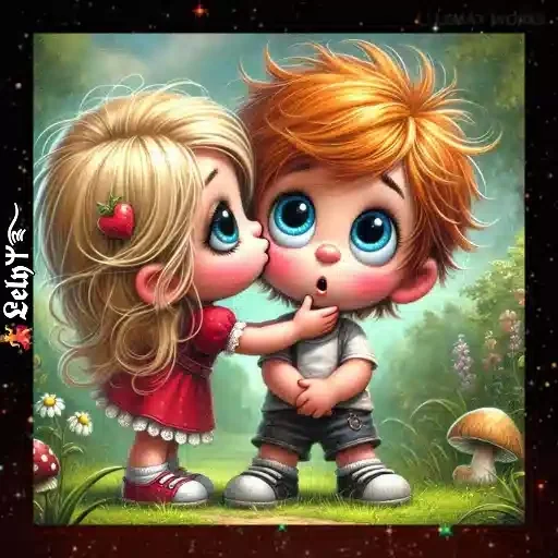 Menina loira com um morango no cabelo beija o menino ruivo no rosto enquanto ele olha surpreso com a mão na boca.