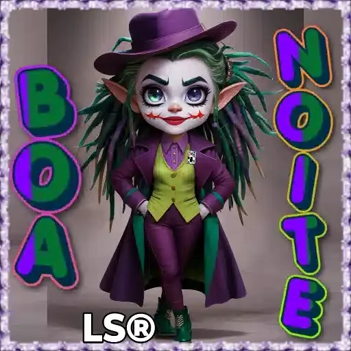 Personagem de aparência feminina com traços do Coringa, usando chapéu roxo, roupa roxa e colete amarelo. Letras coloridas 'BOA NOITE' ao lado.