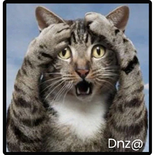 Gato cinza com marcas pretas, olhos amarelados e boca aberta, com as patas na cabeça. Fundo azul. Texto 'Dnz@' no canto inferior direito.