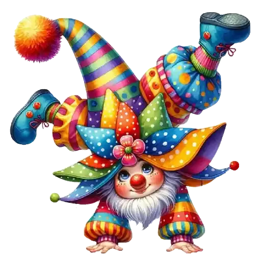 Um clown colorido e engraçado fazendo uma pose divertida, com um chapéu grande e uma barba branca.