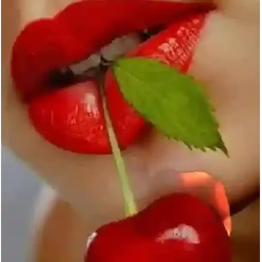 Lábios pintados de vermelho com uma cereja e uma folha verde entre eles.