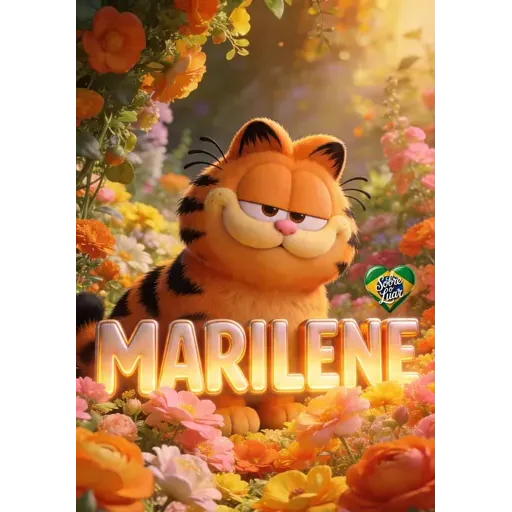 Um gato laranja com manchas pretas, parecido com o Garfield, aparece em um cenário de flores coloridas com o nome 'MARILENE' em letras grandes e brilhantes.