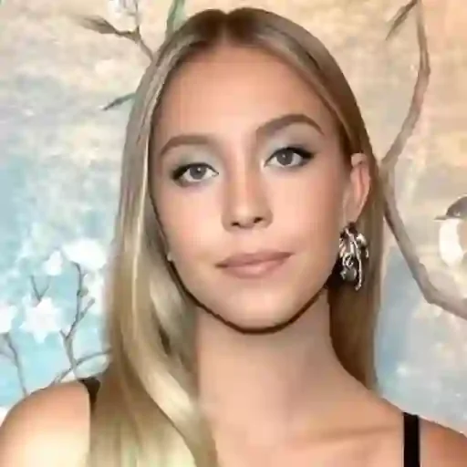 Rosto de uma mulher jovem com cabelo loiro e maquiagem discreta, fundo com árvore e flores brancas.