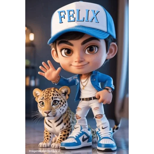 Menino de desenho animado com um boné azul e branco que diz 'FELIX', ao lado de um filhote de leopardo. Ele está usando uma jaqueta azul, camiseta branca, calças brancas e sapatos azuis e brancos.