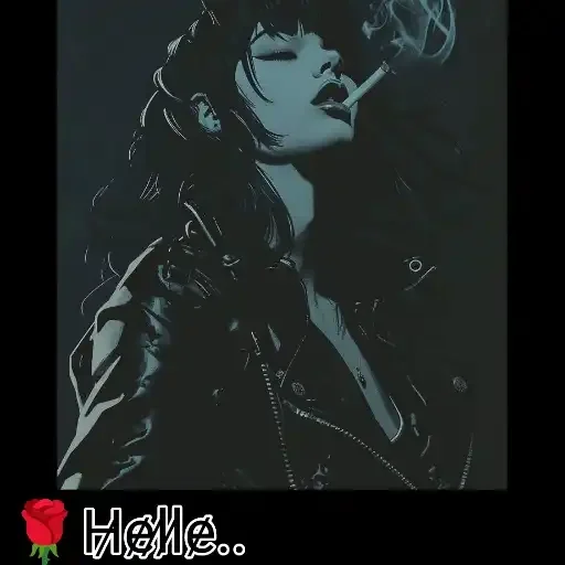 Uma mulher com cabelo escuro e jaqueta, fumando um cigarro com o olhar para cima, contra um fundo escuro. A imagem tem um tom azulado e há um texto 'Helle..' na parte inferior.