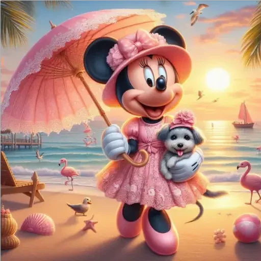 Mickey Mouse vestido de Minnie com um cachorro no colo, em uma praia com guarda-sol rosa, ao pôr do sol. Ela usa um vestido rosa com flores brancas e sapatos rosas.