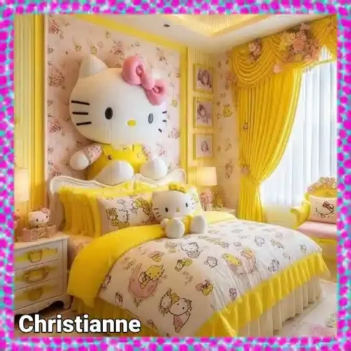 Quarto rosa com cama e decoração da Hello Kitty, cortinas e parede rosa, com o nome 'Christianne' no canto.