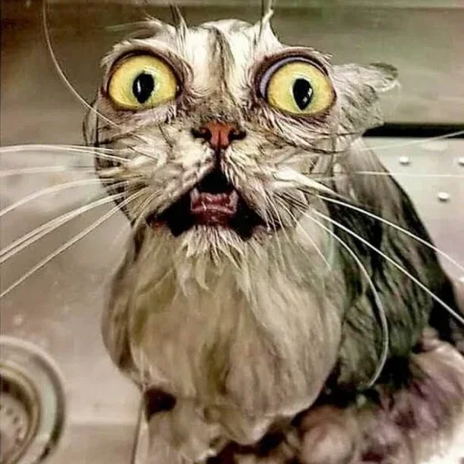 Gato cinza com olhos grandes e arregalados, parecendo surpreso ou assustado. O gato tem bigodes longos e uma expressão…
