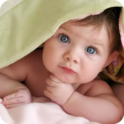 Um bebê deitado de bruços com a cabeça apoiada na mão, coberto por um pano verde claro. O bebê tem olhos azuis e cabelos castanhos.