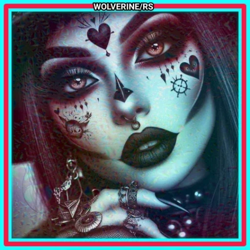 Rosto de uma mulher com maquiagem pesada e artística, incluindo corações, estrelas e outros símbolos no rosto. Ela tem olhos castanhos e cabelos escuros.