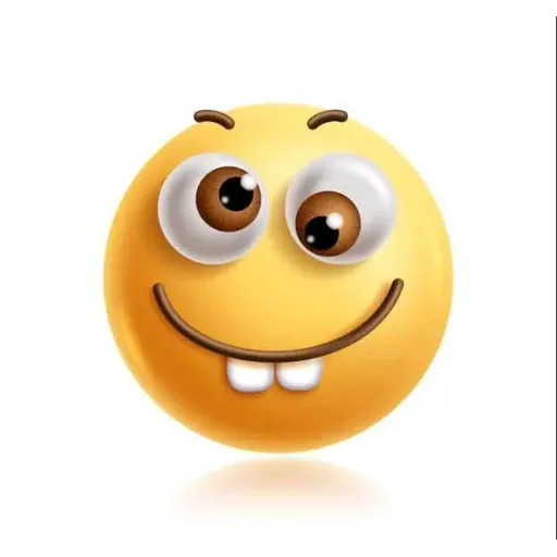 Um emoji amarelo com um sorriso largo e olhos grandes e engraçados, com sobrancelhas finas.