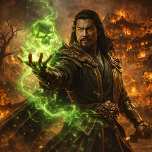Um homem com longos cabelos castanhos e barba, vestido com uma túnica escura, lança uma mão com energia verde brilhante e uma caveira etérea pairando ao lado, em meio a um cenário de chamas e cinzas.