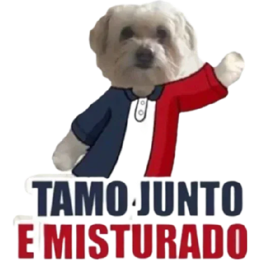 Um cachorro de pelúcia com expressão neutra vestindo uma camisa meio azul e meio vermelha, com o texto 'TAMO JUNTO E MISTURADO' embaixo.