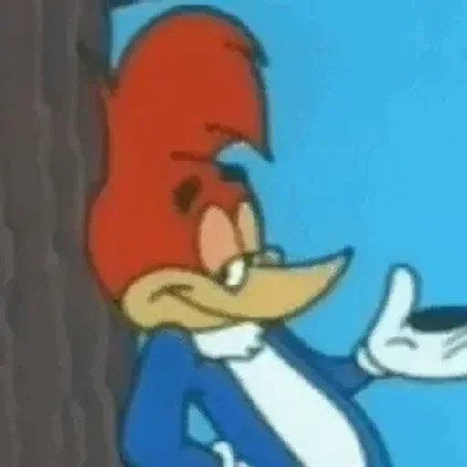 Um pica-pau cartoon com penas vermelhas, bigode e bico amarelos, e um olho franzido, vestindo um blazer azul e uma camisa branca, fazendo um gesto com a mão.