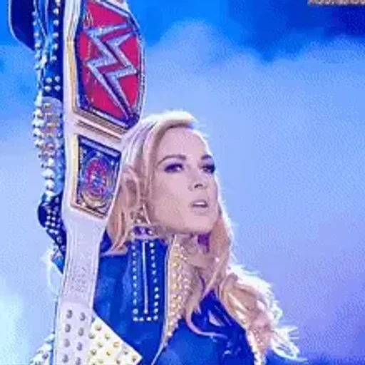 Uma mulher loira com um cinto de campeonato de luta livre, com um fundo azul. Ela está usando um top azul e tem uma expressão séria.