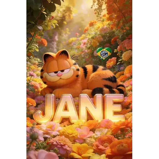 Garfield deitado em um jardim florido com o nome 'JANE' em letras grandes e iluminadas. O gato tem expressão relaxada e é rodeado por flores de várias cores.