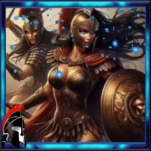 Uma guerreira feminina com armadura dourada e capacete, segurando um escudo, com outra guerreira ao fundo. Ela tem cabelos pretos e azuis brilhantes ao redor.