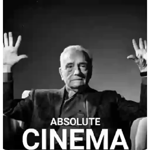 Um homem mais velho com as mãos levantadas e um olhar sério, com o texto "ABSOLUTE CINEMA" em letras grandes na parte inferior.