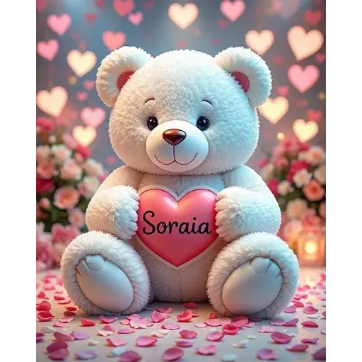 Um ursinho de pelúcia branco com um coração rosa que tem o nome 'Soraia' escrito em preto. O ursinho está sentado em um fundo de flores e corações.