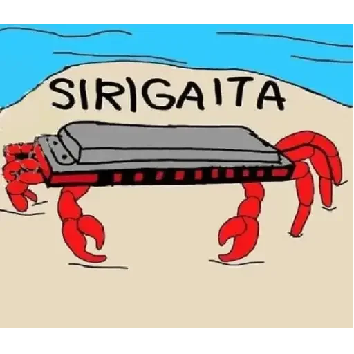 Um desenho de um animal com corpo de máquina de lavar louça e pernas de caranguejo, com o texto 'SIRIGAITA' acima. O fundo é uma praia com areia bege e mar azul.