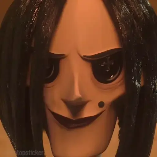 Rosto de uma menina com olhos grandes e arregalados, sorriso largo e cabelo preto. Ela parece assustadora.