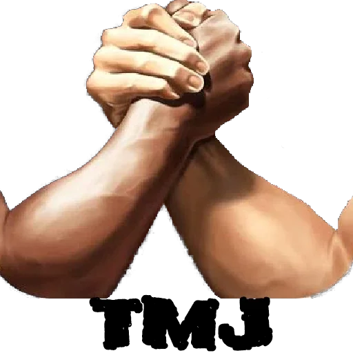Dois braços musculosos com as mãos entrelaçadas, formando um gesto de força ou apoio. Abaixo, está escrito 'TMJ' em letras pretas.