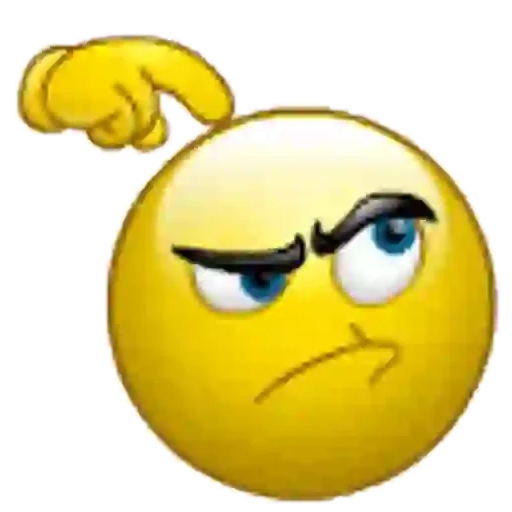 Rosto de emoji amarelo com expressão de desconfiança e dedo indicador levantado na cabeça.