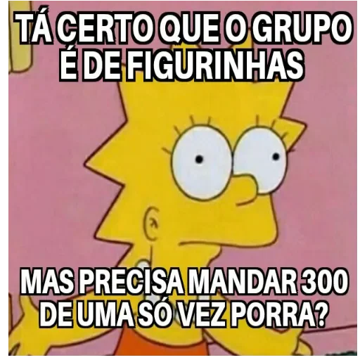Lisa Simpson com expressão de desaprovação, fundo rosa. Texto: 'TÁ CERTO QUE O GRUPO É DE FIGURINHAS MAS PRECISA MANDAR 300 DE UMA SÓ VEZ PORRA?'