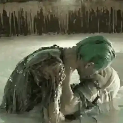 Uma estátua de uma mulher com cabelo verde sentada em uma posição contemplativa em um ambiente com neve ou gelo.