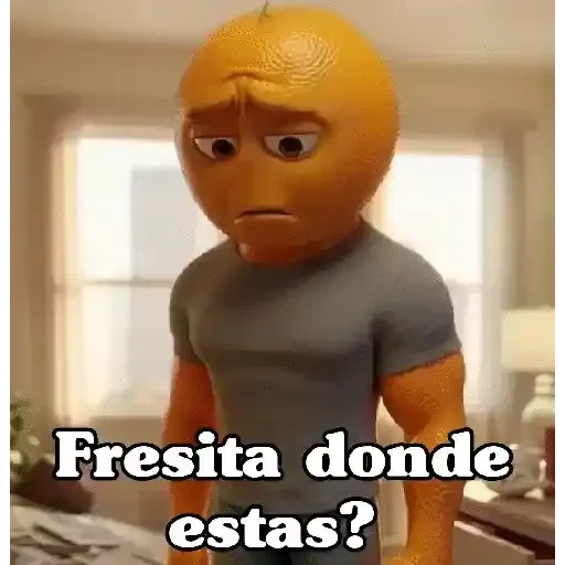 Uma figura de uma laranja com expressão facial de preocupação ou ansiedade, vestindo uma camiseta cinza, com o texto 'Fresita donde estas?' sobreposto.