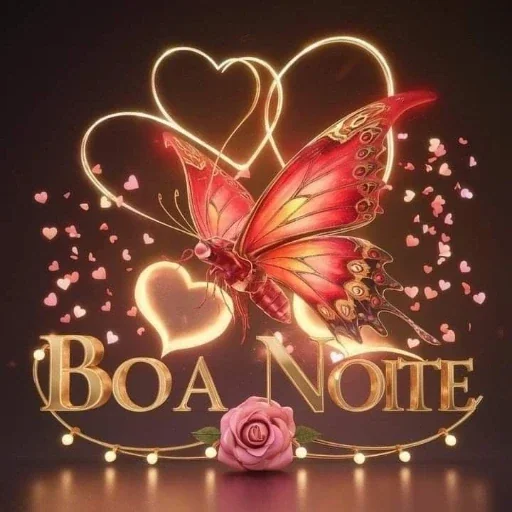 Uma borboleta rosa com detalhes dourados voa em frente a dois corações luminosos e uma rosa rosa, com a frase 'Boa Noite' em letras douradas.