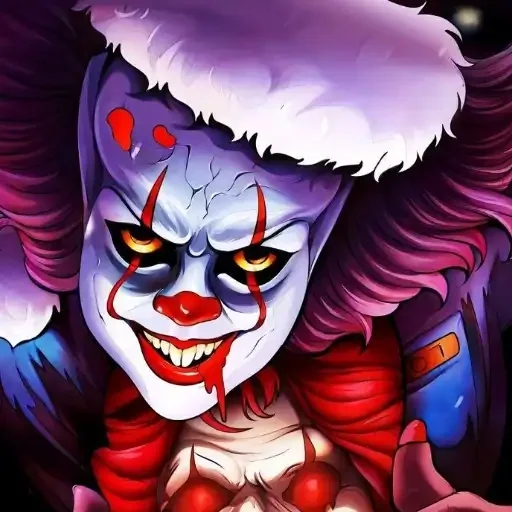 Um clown com maquiagem branca e vermelha, olhos amarelos e cabelos roxos, com expressão assustadora e sangue no rosto.