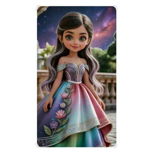 Uma menina com cabelo castanho e vestido colorido com flores está diante de uma varanda com vista para o céu noturno estrelado.