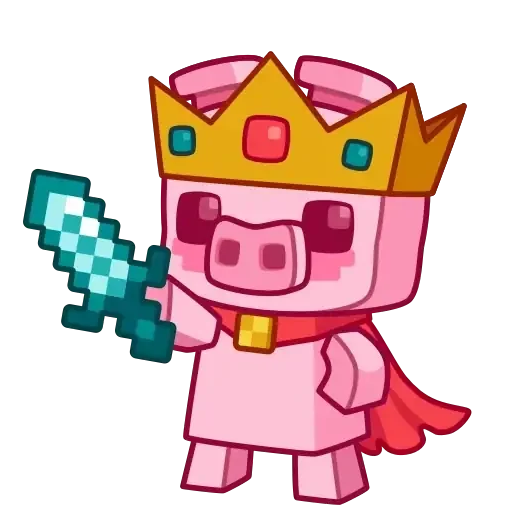 Um porco rosa usando uma coroa dourada e uma capa vermelha, segurando uma espada pixelada verde.
