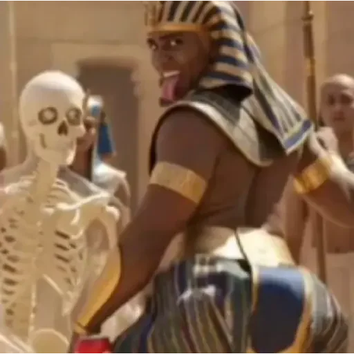 Um homem vestido como faraó egípcio ri enquanto olha para um esqueleto. Ele usa uma faixa de cabeça listrada e uma pulseira no braço.